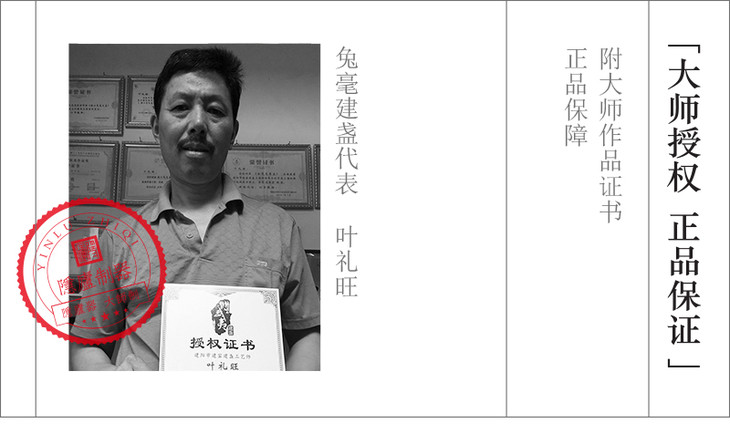 2016年3月叶礼旺师傅的作品在河南开封举办的第一届开封市宋盏文化研究选拔赛中荣获“金奖”并授予“优秀宋盏制作人”称号,能够在宋代国都被授予此等荣誉,这不仅是对工艺作品的肯定,也是一种文化的归属,其意义非凡;2015年10月叶礼旺师傅的作品在南平市建阳区首届建窑建盏作品大赛(工艺传承)中荣获“金奖”,这是建盏发源地首届作品竞赛,参加作品之多,竞争程度的激烈可想而知;2015年11月在中国(北京)国际文创产品交易会中叶礼旺师傅的作品荣获工艺美术华表“金奖”;不仅如此,他的作品在上海、深圳、厦门等地都得到了不同的奖项。叶礼旺建盏是用实力打拼出来的,其作品在建盏界也得到了充分的肯定。制作建盏的过程是一种对生活的态度,以大度之心待大气之器,亦是完美!