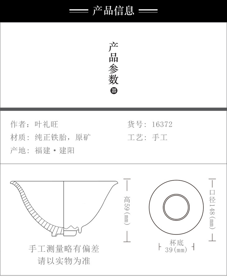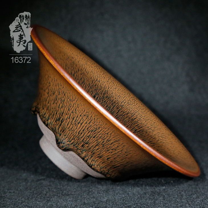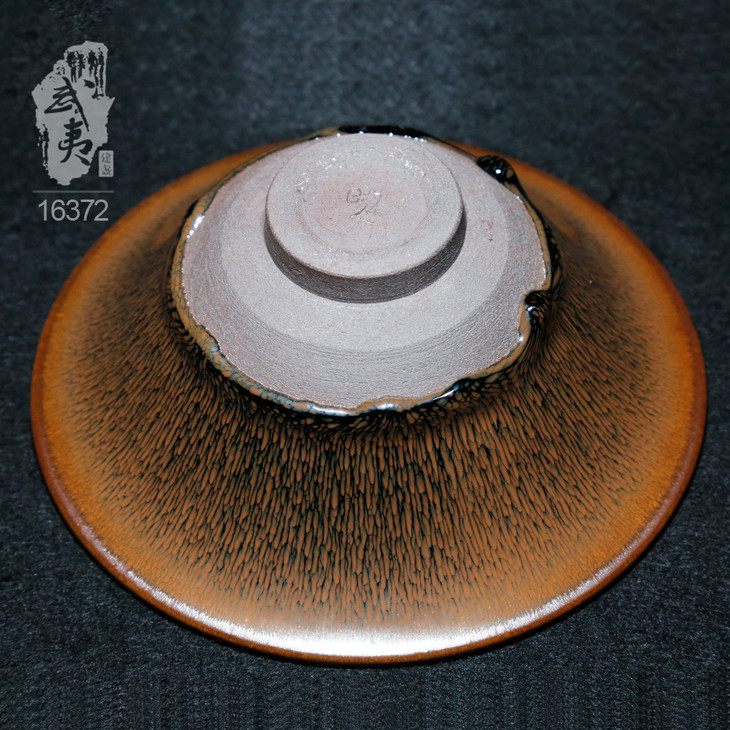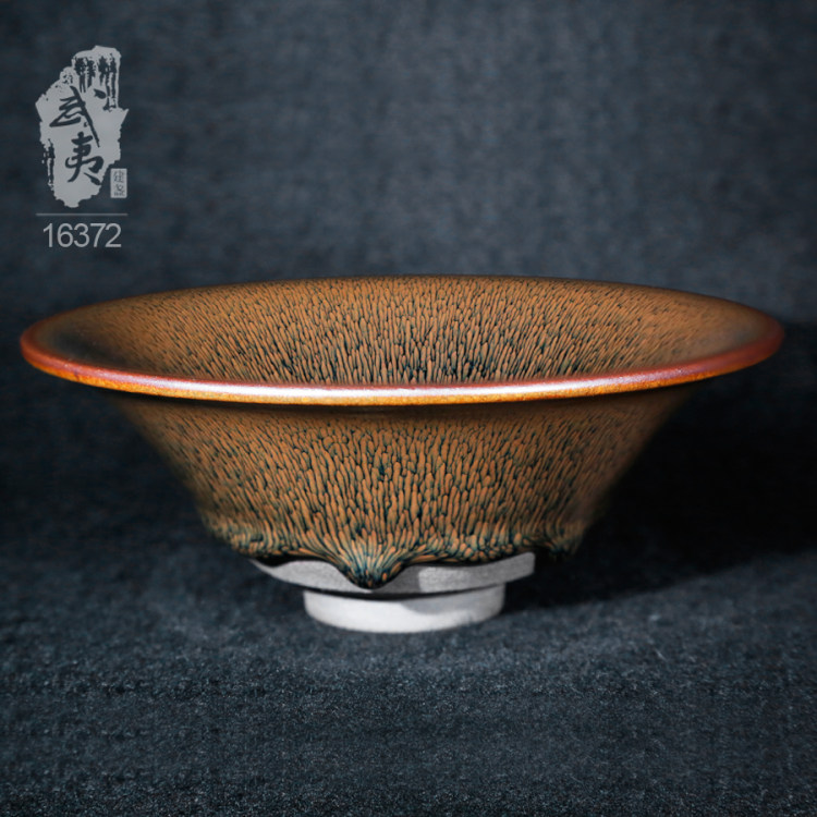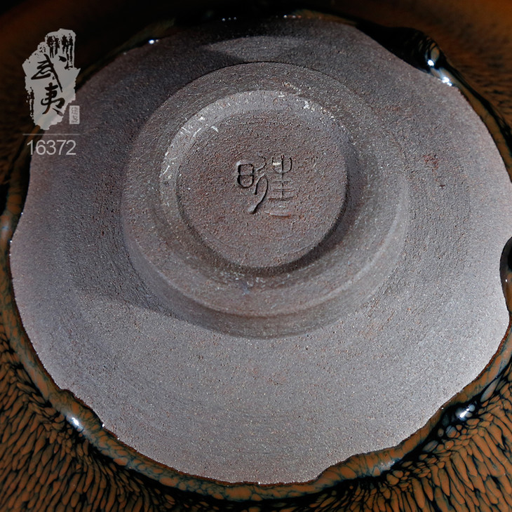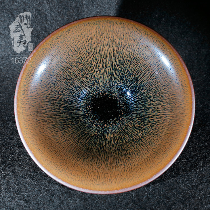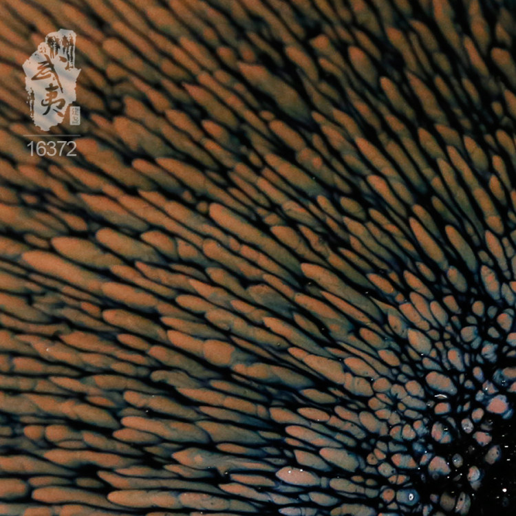 叶礼旺专注兔毫盏技艺研究多年,传承宋代生胚上釉、地方原矿釉和草木灰配釉的传统工艺。烧制的兔毫盏胎土纯正,釉色温润,器型优雅,兔毫斑纹清晰密布,丝丝相连,尤其擅长大盏的制作。古法技艺下产出的兔毫盏,毫丝立体,铁胎独特,干口有度,与宋代兔毫盏极为相似,曾被授予“优秀宋盏制作人”的称号。