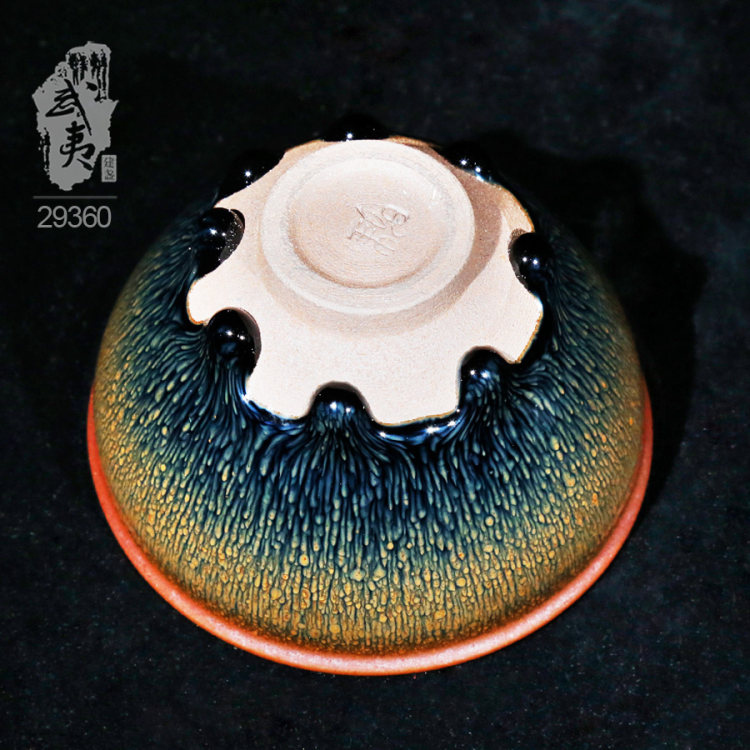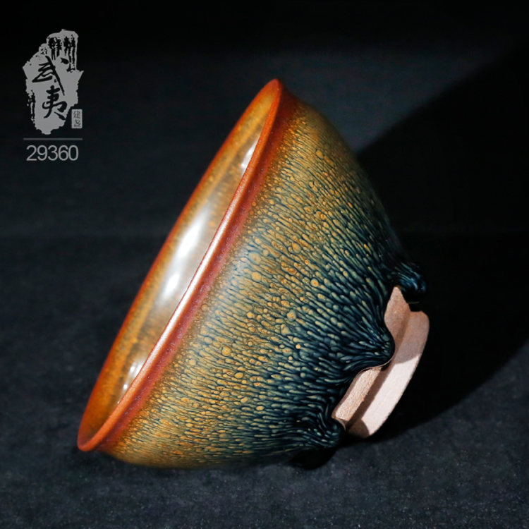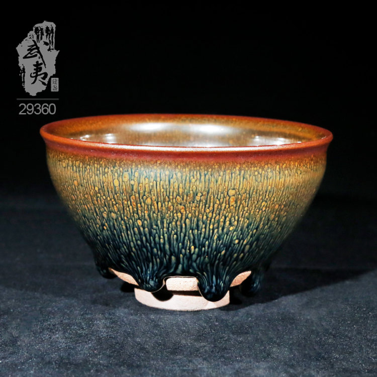 叶礼旺专注兔毫盏技艺研究多年,传承宋代生胚上釉、地方原矿釉和草木灰配釉的传统工艺。烧制的兔毫盏胎土纯正,釉色温润,器型优雅,兔毫斑纹清晰密布,丝丝相连,尤其擅长大盏的制作。古法技艺下产出的兔毫盏,毫丝立体,铁胎独特,干口有度,与宋代兔毫盏极为相似,曾被授予“优秀宋盏制作人”的称号。