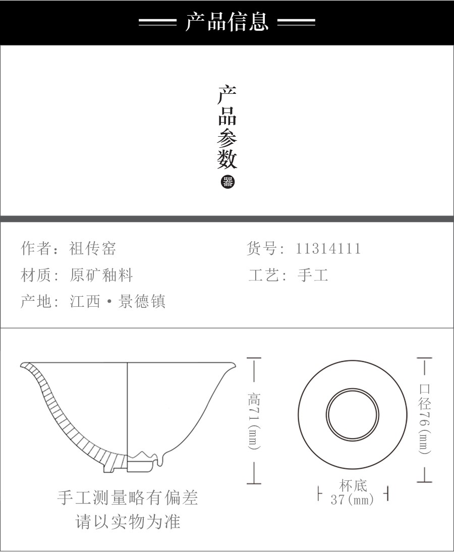 三、由于手工制品以及烧制过程中产生的窑变带来的特殊性,同款作品也有可能会在外观、色泽、尺寸和重量存在轻微差异,请以实际收到的作品为准;