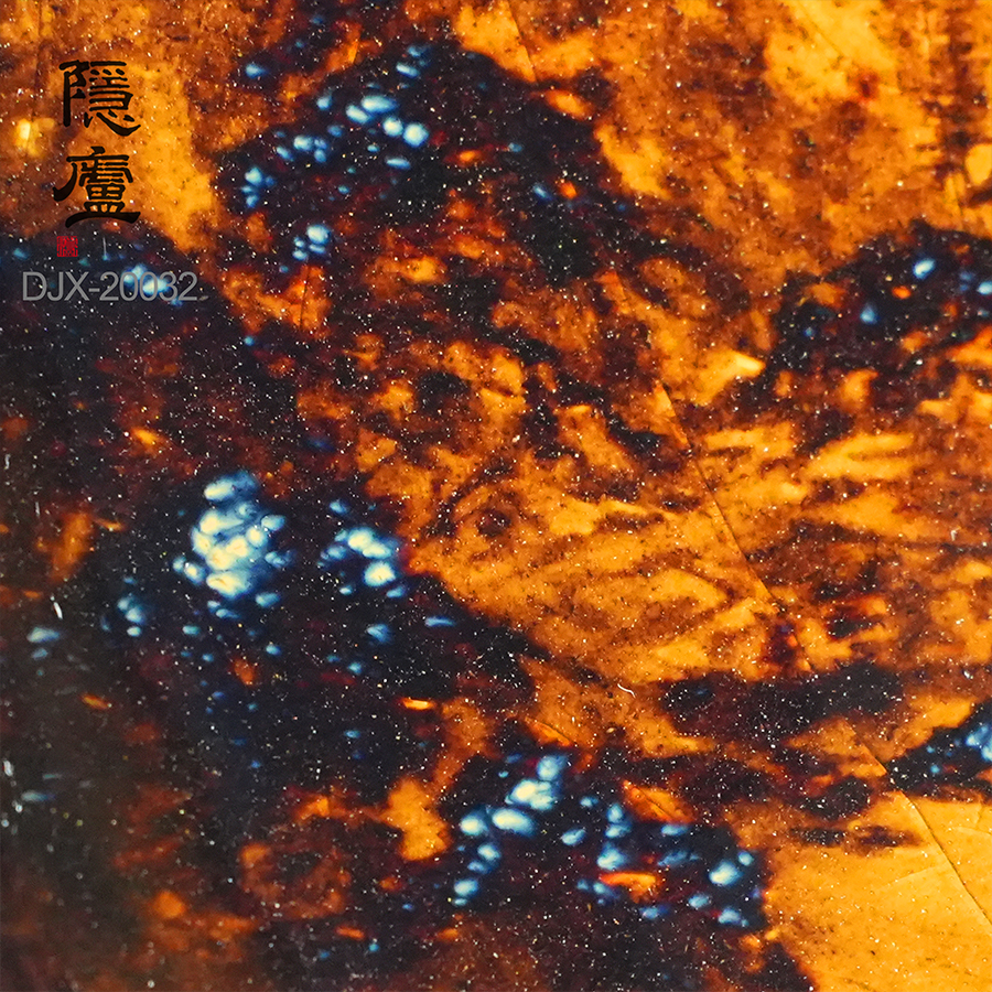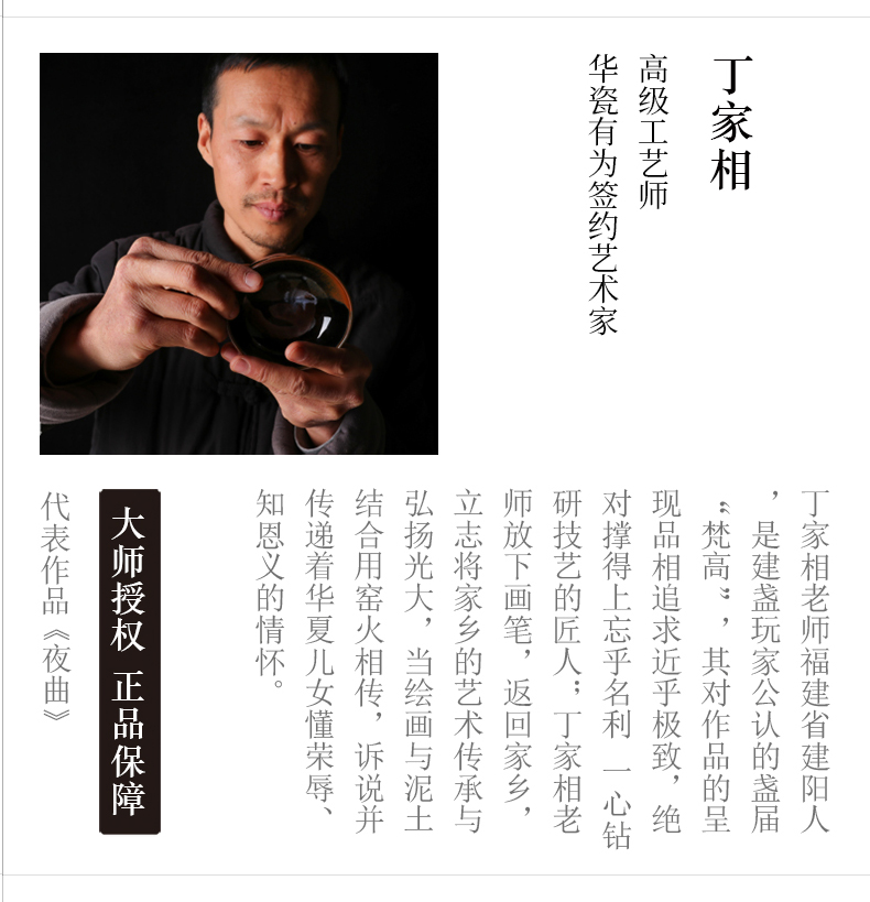 丁家相目前主制油滴建盏,他把制盏与画画相结合,追求完美,不仅从器型上讲究端庄古朴,器型不好,有瑕疵的根本不进下一步骤上釉烧制,更是从油滴上下功夫,力求油滴的形色完美结合,他烧制出的建盏,器型完美,油滴中折射出优雅的蓝色光泽,油滴形状从大到小,均匀分布于盏璧之上。用他制作的油滴盏沏茶时,在茶水的折射下,蓝油滴焕发出五彩光芒,和茶水交映,甚为神奇,很好的诠释了建盏的难以捉摸但有耀眼存在的特性。