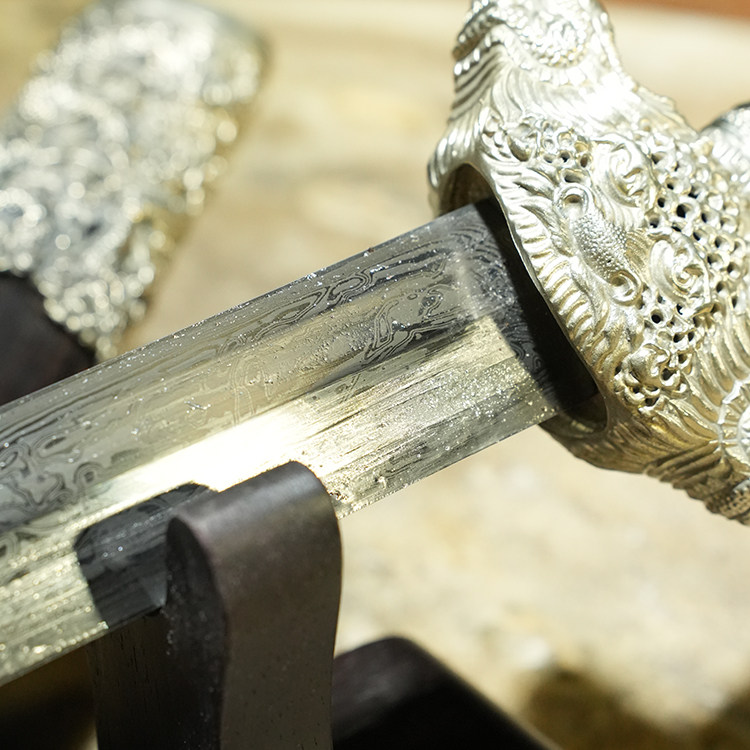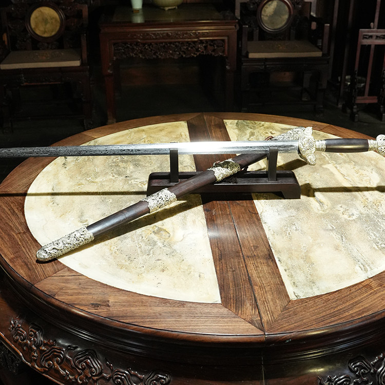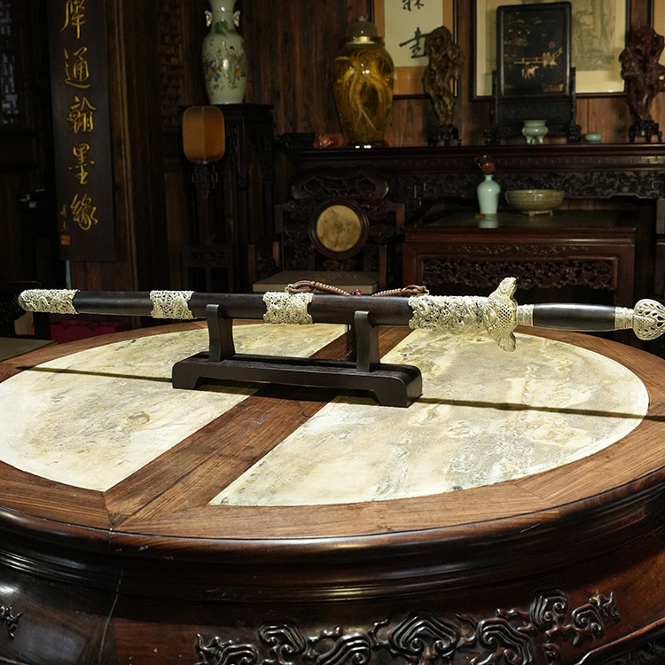 材质:古法自炼百炼钢剑身,白铜手工精雕刻外装,上等黑檀木鞘