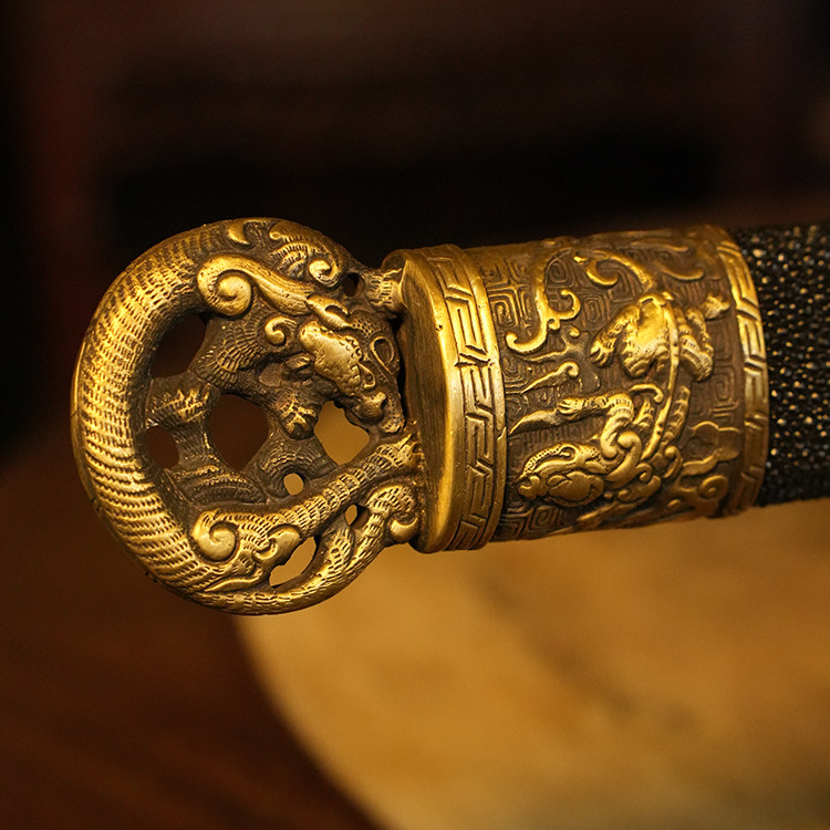 材质:古法自炼百炼钢剑身 ,黄铜装质地、手工雕外装,上等黑檀木剑鞘