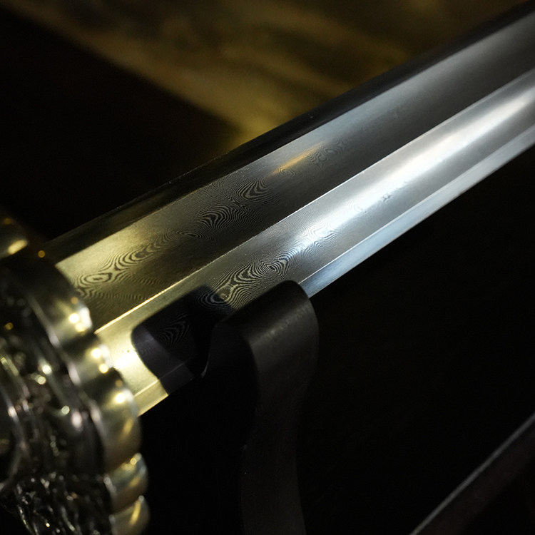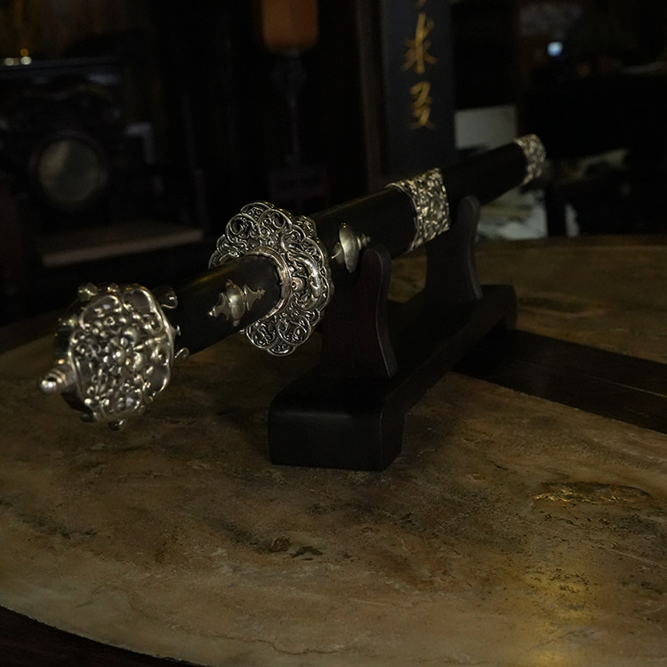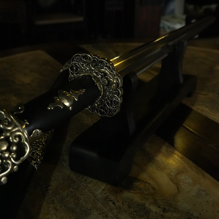 材质:古法锻制自炼百炼钢剑身,白铜手工精雕刻外装,上等黑檀木剑身