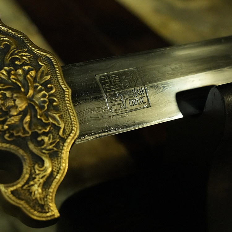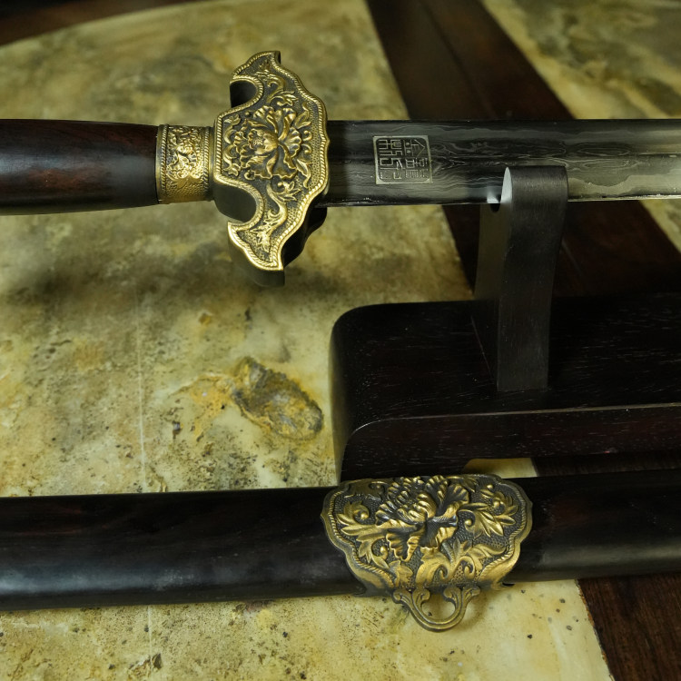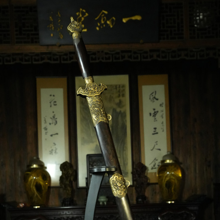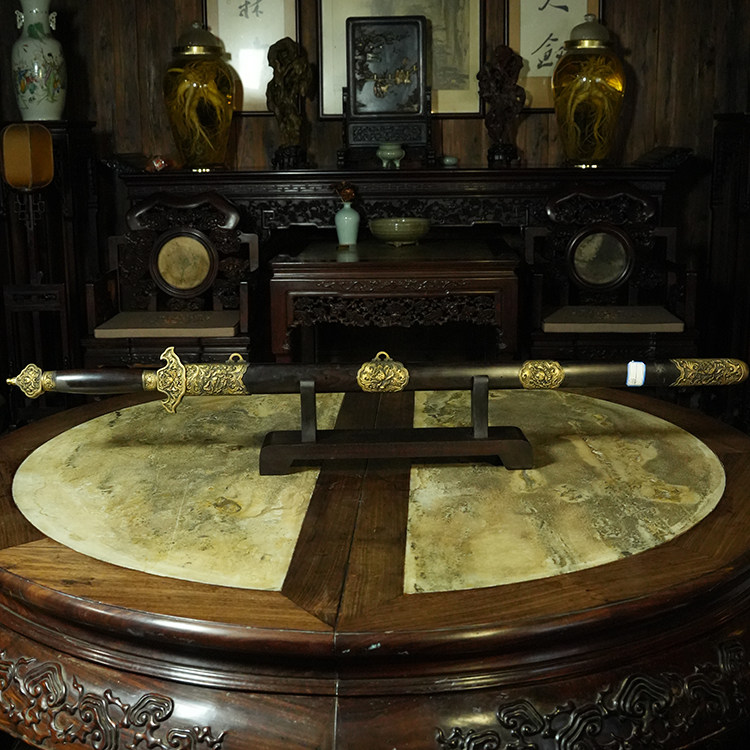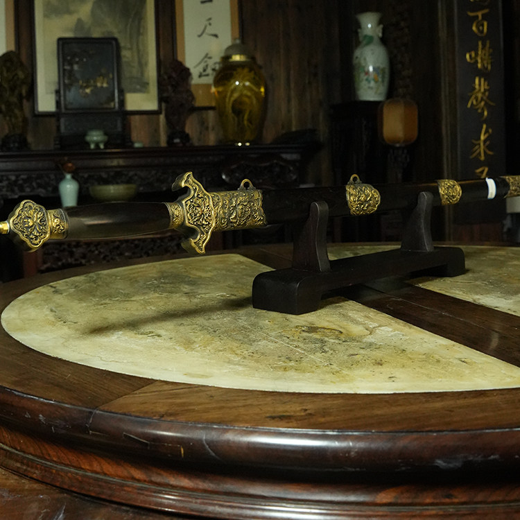 材质:古法锻制自炼百炼钢剑身,黄铜装质地、手工雕外装,上等黑檀木剑鞘