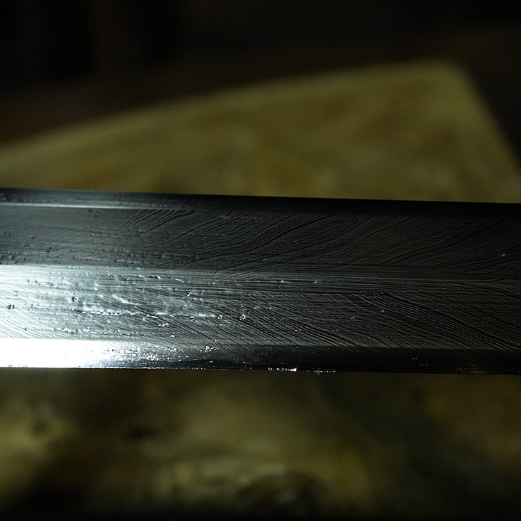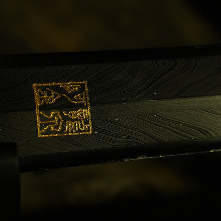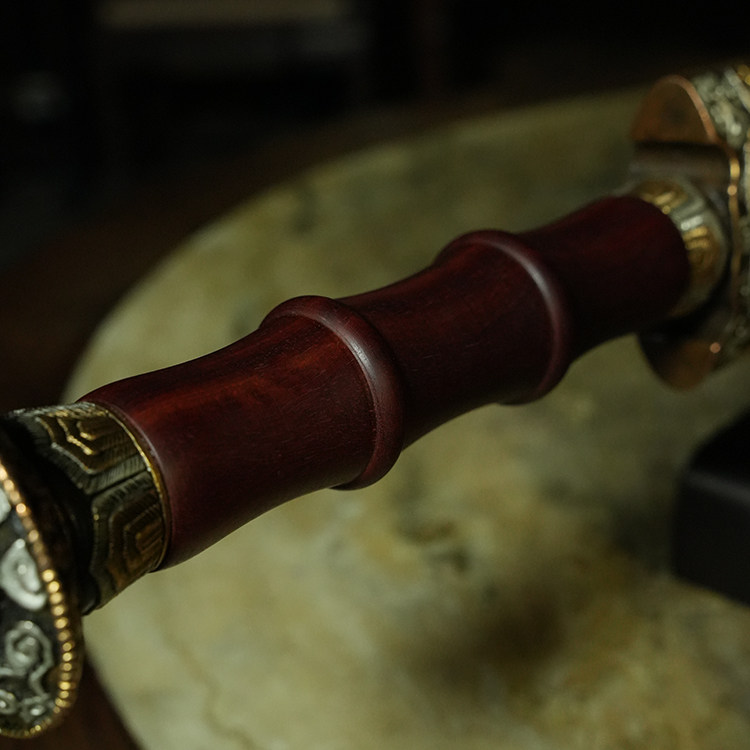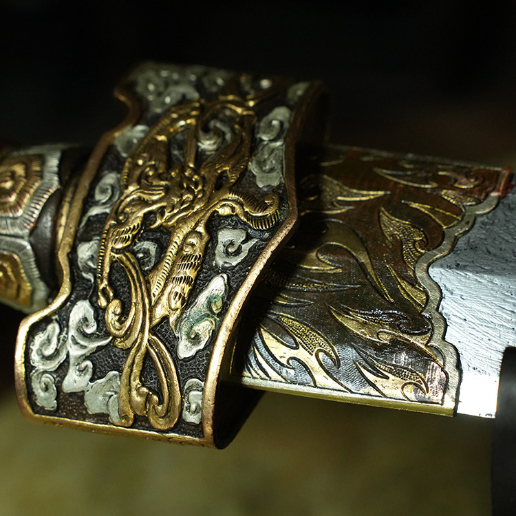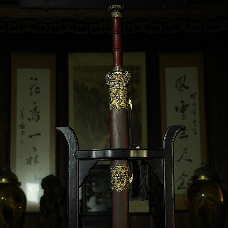材质:古法锻制毛铁草钢剑身,铜底鎏金银外装,上等大叶紫檀木鞘